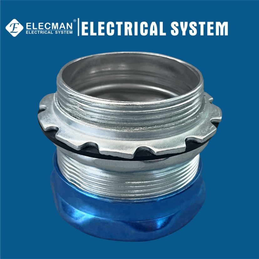 ELECMAN® el 1/2 adentro a 4 en el tipo a prueba de lluvia no-aislado de acero de la compresión de los conectores de EMT se utilizan en ubicaciones mojadas para enlazar los conductos del thinwall de EMT a las cajas de conexiones eléctricas o a los recintos. los conectores Lluvia-apretados de la compresión de EMT se han diseñado para cumplir con los nuevos requisitos lluvia-apretados de la prueba. La construcción de acero asegura la protección mecánica y el conducto a la caja de conexiones o al recinto eléctrica señalada.
