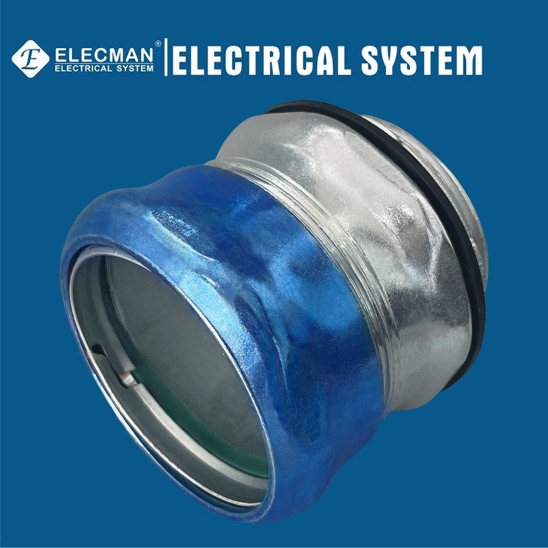 Los conectores de acero a prueba de lluvia de la compresión de ELECMAN® EMT se utilizan para unirse al conducto de EMT a una caja o a un recinto en ambientes a prueba de lluvia. El diseño previene la filtración del agua en el conducto, la caja o el recinto. Junta en los hilos masculinos de la instalación de los sellos del conector para la conexión a prueba de lluvia entre la caja y el conector
